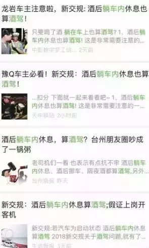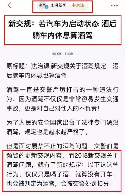 另外,近日一条关于酒驾的文章风靡网络,酒后躺车内休息也算酒驾?只要挪车就算酒驾?乘坐酒驾车算共犯?老司机们看了这“新规”瞬间凌乱: