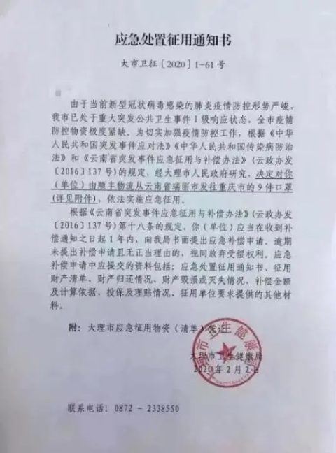 经查,大理市违法扣押征用防疫口罩问题属实,情节恶劣,性质严重,严重干扰了全国防疫工作大局,严重破坏了防疫工作纪律,严重损害了云南防疫工作形象,充分暴露出大理市委、市政府在紧要关头,无视政治纪律,漠视国家法律,本位主义严重,形式主义、官僚主义问题突出。 依据《中国共产党问责条例》《中国共产党纪律处分条例》等有关规定,决定对5个单位、8名责任人进行问责处理。 (一)给予5个责任单位通报问责。 1。给予大理州委、州政府通报问责,责令作出书面检查。 2。给予大理市委、市政府通报问责,责令作出书面检查。 3。给予大理市纪委监委通报问责,责令作出书面检查。 (二)给予5名责任人党纪政务处分 1。给予大理市委书记高志宏同志党内严重警告处分、免职处理。 2。给予大理市委副书记、市长杜淑敢同志撤销党内职务、政务撤职处分。 3。给予大理市政府党组成员、副市长娄增辉同志撤销党内职务、政务撤职处分。 4。给予大理市委办公室常务副主任李磊同志党内警告处分。 5。给予大理市市场监管局党组书记、局长袁爱忠同志政务记过处分。 (三)对3名责任人诫勉问责 1。给予大理州委副书记、州长杨健同志诫勉问责。 2。给予大理市委常委、常务副市长杨矗同志诫勉问责。 3。给予大理市委常委、市纪委书记、市监委主任张琮同志诫勉问责。 云南省纪委省监委要求,各级党委、政府和各级领导干部,要引以为戒,汲取深刻教训,增强“四个意识”,坚定“四个自信”,做到“两个维护”,坚决贯彻落实党中央的决策部署,强化法治思维,坚决防止和反对本位主义,坚决纠治形式主义、官僚主义,统筹做好疫情防控和经济社会发展工作,为实现决胜全面小康社会、决战脱贫攻坚目标任务,推进云南跨越式发展提供坚强政治保障和纪律保障。 事件背景 此前,一张云南省大理白族自治州大理市卫健局发出的《应急处置征用通知书》引发网友关注。 《通知书》内容显示,为切实加强疫情防控工作,从云南省瑞丽市发往重庆市的9件口罩被“依法实施紧急征用”。