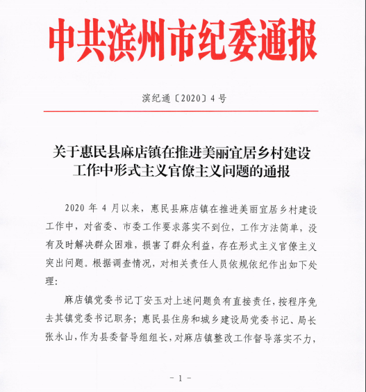 新京报快讯 7月2日,山东滨州市纪委发布一则《关于惠民县麻店镇在推进美丽宜居乡村建设工作中形式主义官僚主义问题的通报》。