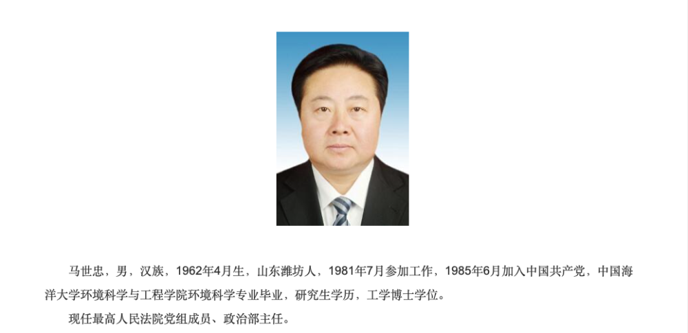 最高法政治部主任马世忠,男,汉族,1962年4月生,山东潍坊人,中国海洋大学环境科学与工程学院环境科学专业毕业,研究生学历,工学博士学位。