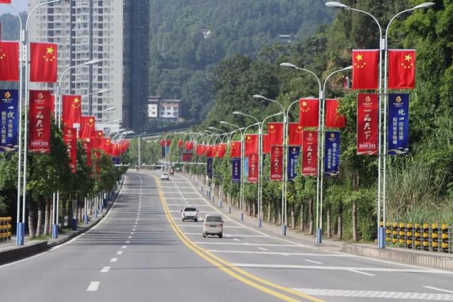 信义高速出口是平昌的大门,道路两边高挂的五星红旗热烈、喜庆。迎接国庆的到来,也迎接远方回家的你!