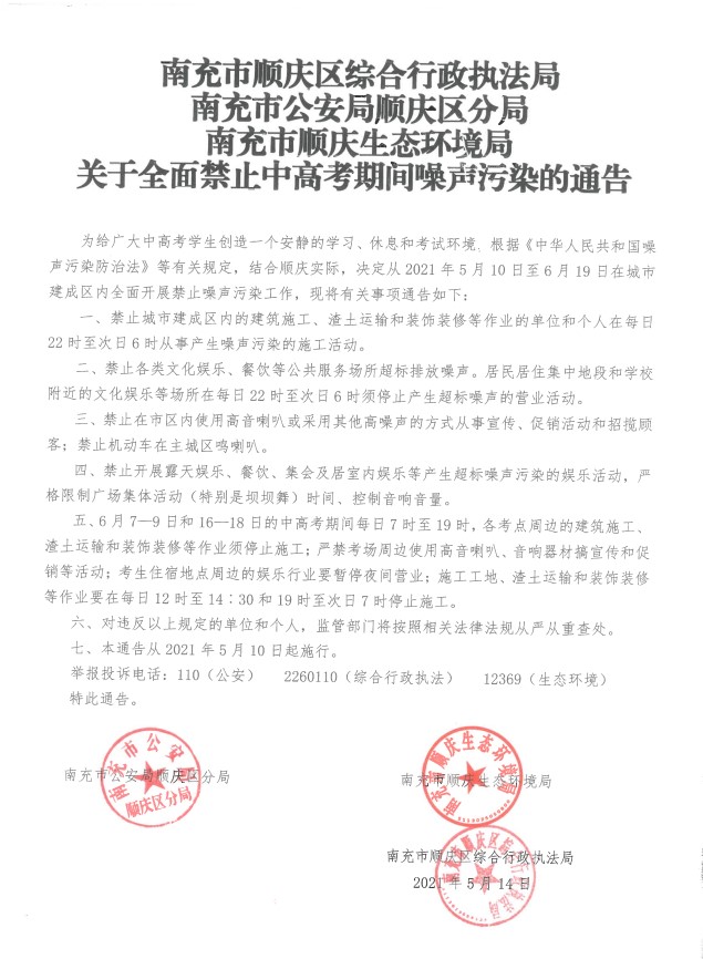 顺庆全媒体 记者 吴雍 距离一年一度的中考、高考越来越近。5月14日,记者从顺庆区综合行政执法局获悉,为给广大考生创造一个优良的学习、考试、生活环境,根据《中华人民共和国环境噪声污染防治法》等有关法律规定,顺庆区自即日起到6月19日中、高考期间,将对噪声严管,市民如发现环境噪声污染问题,可拨打12369、0817-2260110举报。 记者了解到,今年顺庆区将严格按照国家和省相关法律法规要求,依法加强辖区内噪声源的监督管理。在5月14日-6月15日的中、高考期间,该局将积极开展环境噪声污染防治和现场监督检查,并加强与相关部门的沟通协作,形成对各类噪声源的联防联控,为考生提供良好的学习和考试环境。 在施工方面,将禁止城市建成区内参与建筑施工、渣土运输和装饰装修等作业的单位和个人,在每日22时至次日6时从事产生噪声污染的施工活动。在文化娱乐方面,将禁止各类文化娱乐、餐饮等公共服务场所超标排放噪声;对于地处居民居住集中地段和学校附近的文化娱乐等场所,每日22时至次日6时须停止产生超标噪声的营业活动。 同时,在6月7—9日和16—18日的中、高考期间,每日7时至19时,各考点周边的建筑施工、渣土运输和装饰装修等作业须停止施工;严禁考场周边使用高音喇叭、音响器材搞宣传和促销等活动;考生住宿地点周边的娱乐行业要暂停夜间营业;施工工地、渣土运输和装饰装修等作业要在每日12时至14︰30和19时至次日7时停止施工。 “在禁噪期间,我们将定期开展中、高考‘禁噪护考’‘ 五乱治理’等专项行动,大力处罚和震慑噪声扰民及市容乱象;持续加大日常执法力度,加强夜间值班力量,及时有效管控社会生活、建筑施工噪声扰民及市容乱象。”顺庆区综合行政执法局相关负责人表示,市民如发现环境噪声污染问题,可拨打12319或0817-2260110举报。 https://p1-tt.byteimg.com/origin/pgc-image/1b0fcb1ccc8a4bac97c2dc0c1f4609e6?from=pc