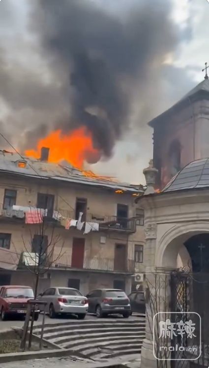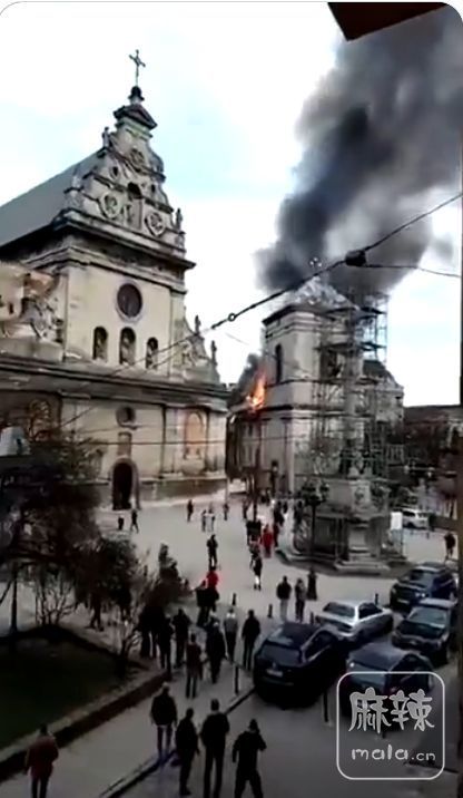 利沃夫古老的伯纳丁修道院因为袭击起火燃烧,该修道院历经战火列入了联合国教科文组织世界遗产名录。