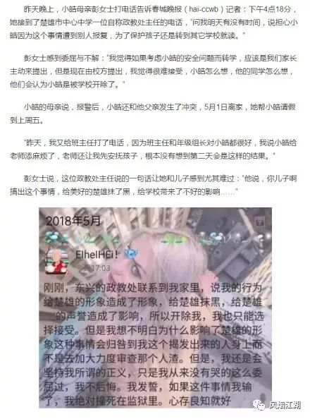“刚刚,东兴政教处说我的行为给楚雄抹黑了,所以开除我。我想不明白为什么影响了楚雄形象的事会归咎于揭发的人身上,而不是去审查那个人渣。但是,我还是会坚持我所谓的正义,我不后悔。我发誓,如果这件事情我输了,我绝对撞死在监狱里。心存良知就好。”