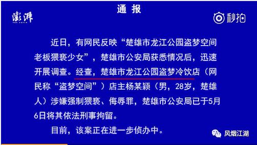 5月9日澎湃新闻报道:云南楚雄一名男高中生,在网络发贴举报一“盗梦空间”游戏室老板猥亵数名少女,5月7日,楚雄警方发布通报称,盗梦空间老板杨某颖涉嫌强制猥亵、侮辱罪,楚雄市公安局已于5月6日将其依法刑事拘留。