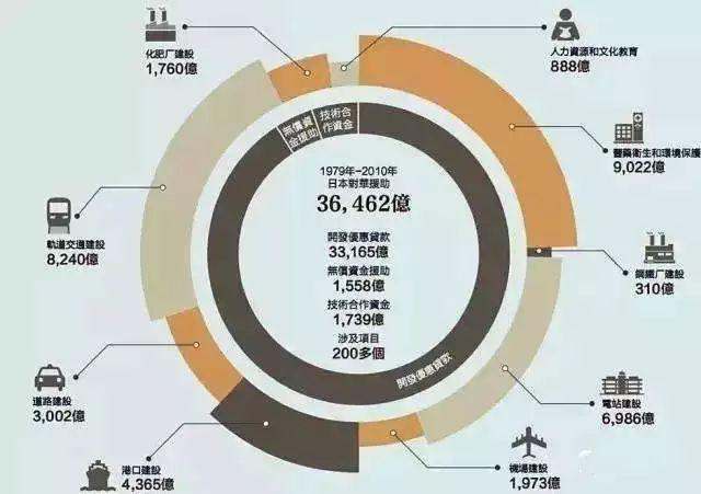 从1979年到2008年,日本为对华ODA提供了3万多亿日元(约300多亿美元)。在最高峰时,日本对华援助占到外部援助的80%以上。上世纪80年代,ODA款项中相当大一部分被用于建设一大批规模大、周期长、技术含量高、施工难度大、占用资金多的基础设施建设项目。