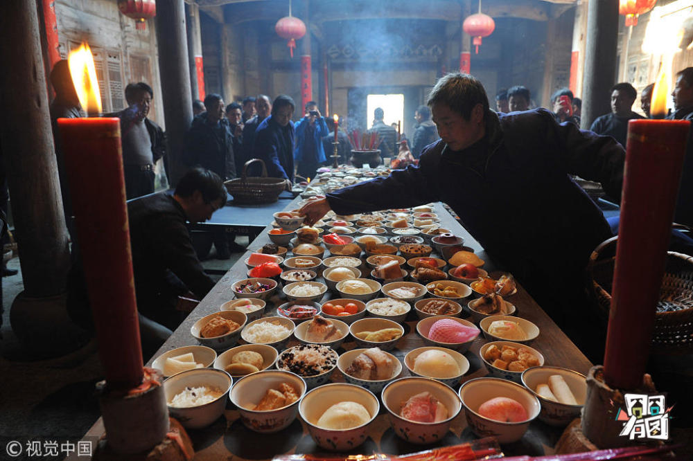 胡剑欢/视觉中国【祠堂祭祖】2014年1月30日,浙江省临安市岛石镇杨川村村民在古祠堂内祭祀。当日是大年除夕,浙江省临安市岛石镇杨川村每家每户提着篮子,装着水果、鱼肉等贡品在古祠堂内祭祀、拜祖等活动,以这种传统而古老的方式过除夕。