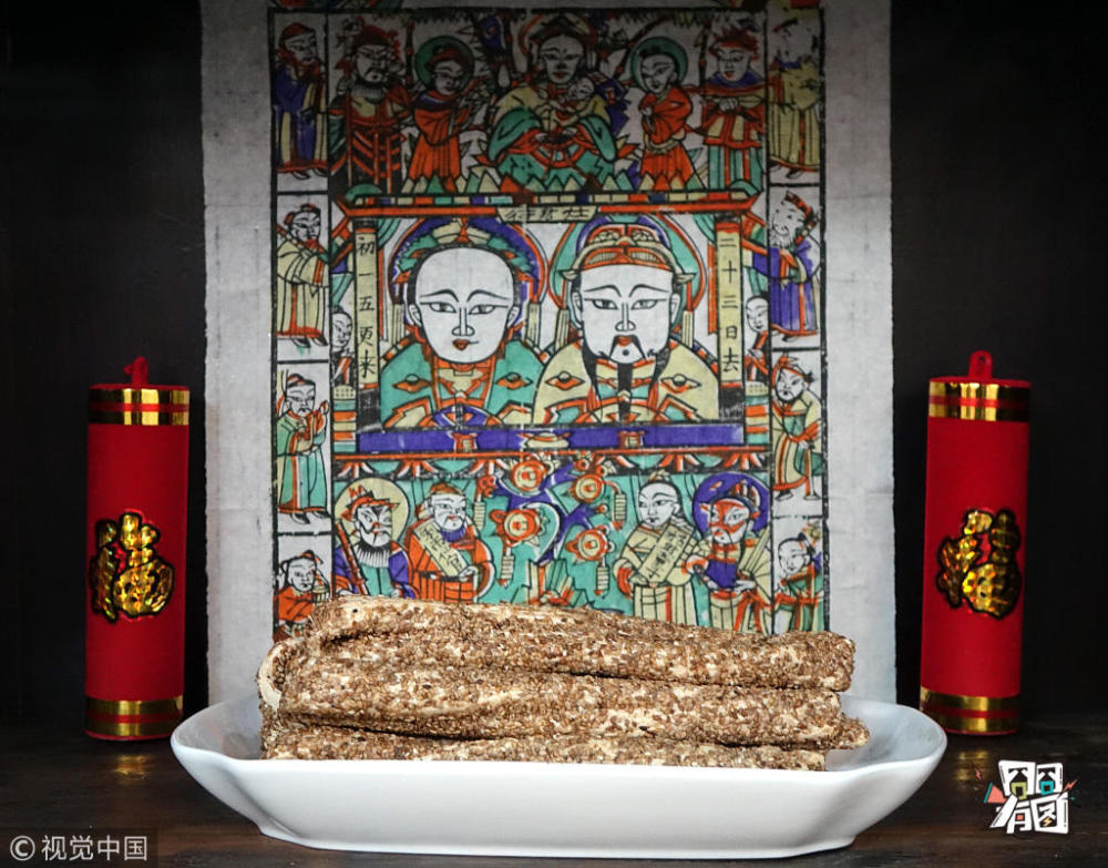 马健/视觉中国【祭灶神】2014年2月11日,河南省郑州市一次展会上的传统年画——灶王爷和老式麻糖。灶神是中国神话中主管饮食的神,有监察人间罪恶掌握一家寿夭祸福的职能。每年腊月二十三,灶王爷都要上天向玉皇大帝禀报这家人的善恶,让玉皇大帝赏罚。于是小年这天,人们会摆一些瓜果、灶糖在灶王像前,以表自己真诚祭拜灶王爷,为的就是让灶王爷在玉帝面前多说好话。