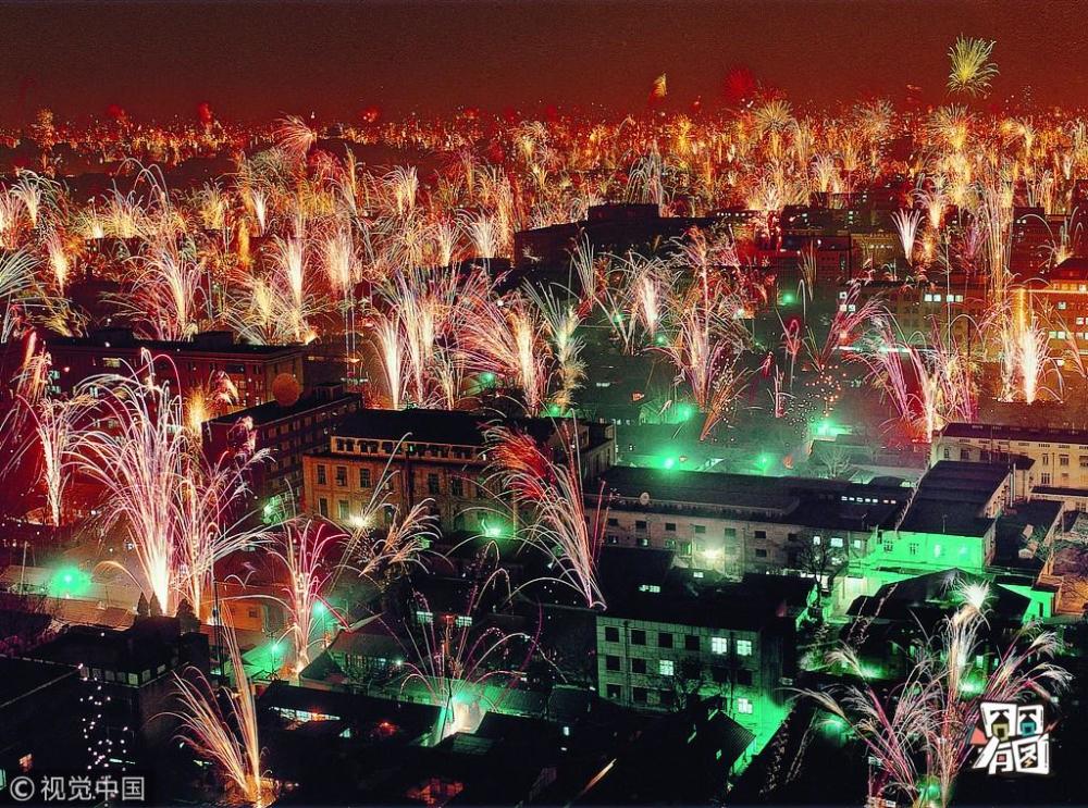 王文波/视觉中国【烟花秀】火树银花除夕夜。1993年,北京,全城各处放烟花庆祝春节。《禁止燃放烟花爆竹的规定》自1993年在北京实施,数百座城市选择禁放烟花。近年来,保留春节燃放烟花爆竹以增加节日气氛的呼声越来越高,禁放烟花爆竹的政策有所松动,由原来的全面禁止调整为指定地点、指定时间的限制燃放。