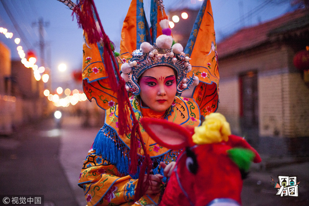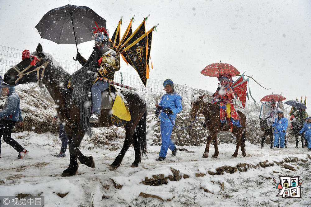 刘强/视觉中国【社火送祝福】2016年2月21日,陕西宝鸡迎来一场降雪,降雪并没阻挡人们耍社火的热情。村民从凌晨零点就开始化妆准备,到七点左右完毕,挨家挨户串门送祝福。
