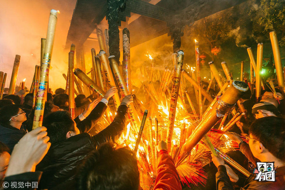 周楠/视觉中国【烧头炷香】2016年2月8日,广东省惠州市,除夕夜的元妙观香火冲天,子夜时分,数万市民排队争“头柱香”,求来年好运程。大年初一,许多人会急着赶去寺庙道观烧香拜佛,更有甚者,为了烧头柱香,在除夕午夜之前就纷纷进庙排队、彻夜未眠、争烧第一炉香。他们认为新年的第一炉香功德最大,可以得到最佳的保佑和祝福。