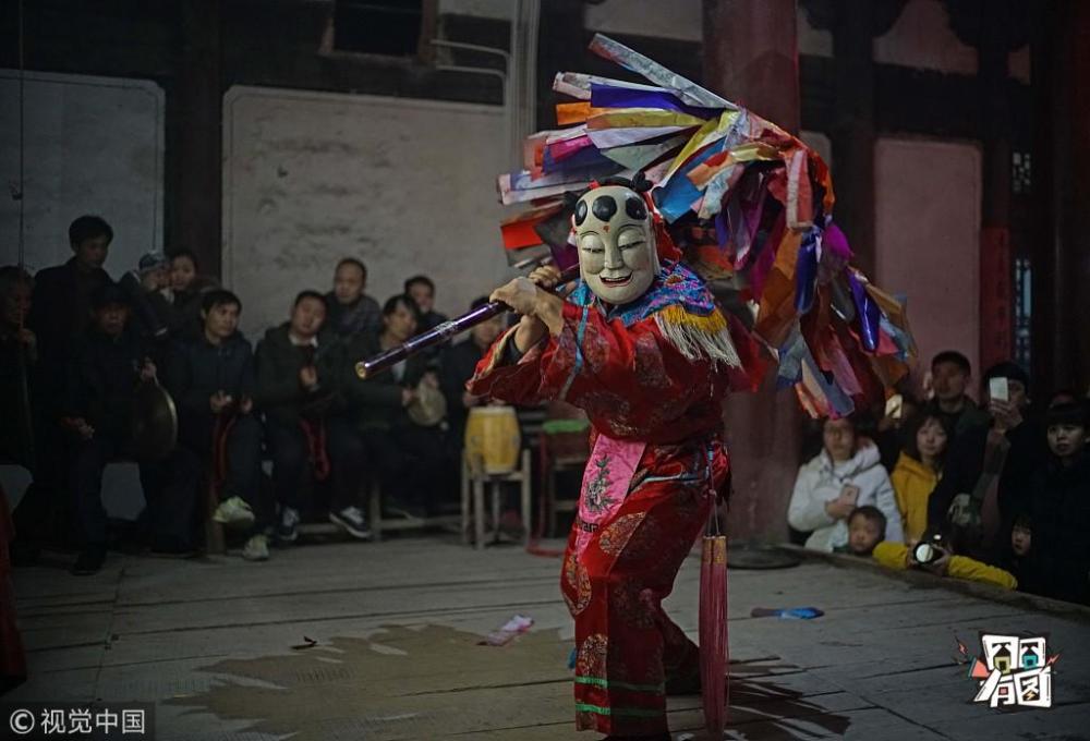 陈杰/新京报/视觉中国【傩戏】2017年2月3日,安徽池州,正月初七晚上,刘街社区姚街组姚氏祠堂,村民进行傩(nuó)戏《伞舞》表演。安徽池州傩始于商周,是一种神秘而古老的原始祭礼,有几千年历史传承,也是中国目前保存最完好、规模最大的傩戏民间艺术。随着城镇化发展,迁出人员居住方式的改变,宗祠文化的影响逐步削弱,傩戏的生存“土壤”也受到影响。