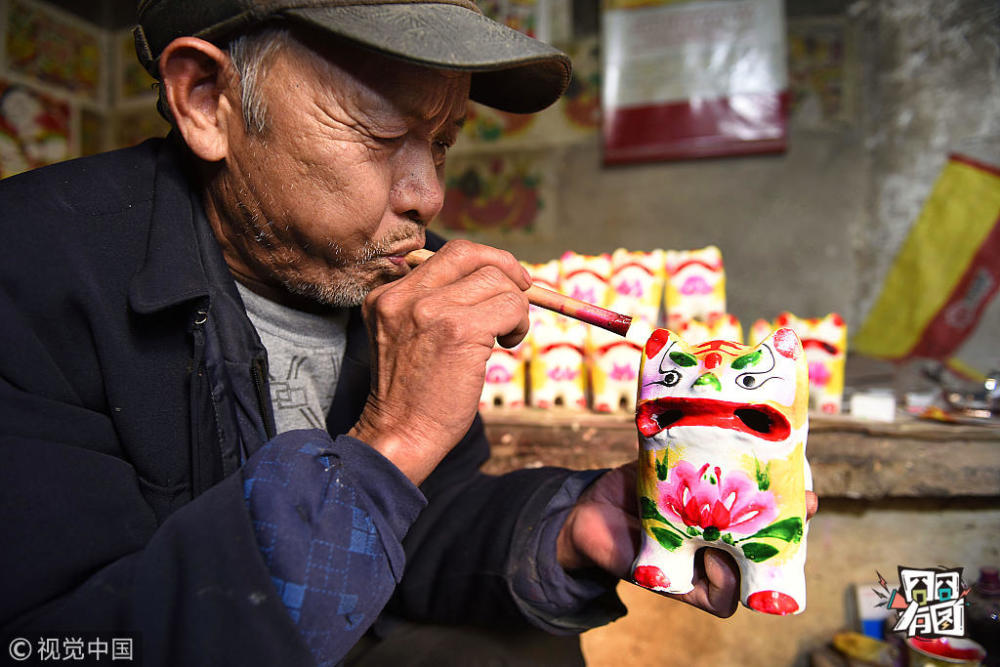 陈为峰/视觉中国【泥塑“叫虎”】2017年1月10日,山东省日照市莒县峤山镇道沟村,民间艺人魏兆忠在制作泥塑彩绘“叫虎”。魏兆忠从15岁跟随父亲学习泥塑彩绘手艺,如今已有50多个年头了。“叫虎”是泥塑彩绘的泥老虎,因内部嵌入特制的“哨子”,玩耍时发出“唔唔唔”的声响,所以叫“叫虎”。