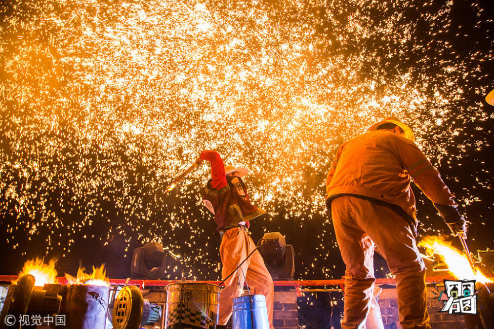 王伟伟/视觉中国【打铁花】2017年2月10日,山西晋中皇城相府景区,伴随着数千名观众喊出的倒计时声,景区城墙顶上铁花飞溅,火树银花。一时间,整座城墙被迸溅出的铁花包围,宛如瀑布从天而降。打铁花,是流传于豫晋地区民间传统的烟火,历史悠久可以追溯到春秋战国时期。