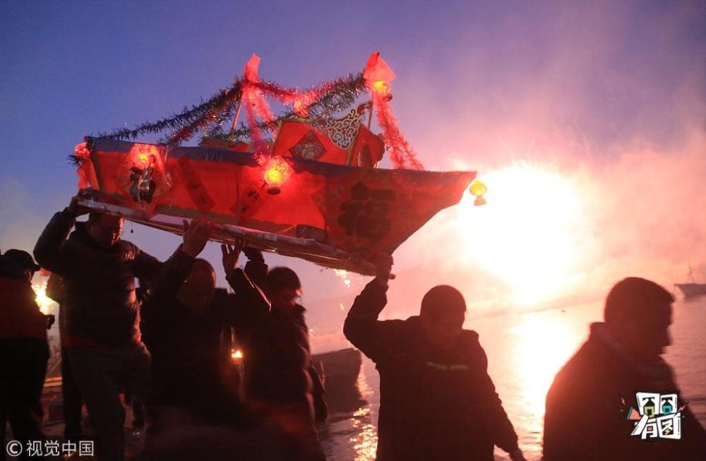 王华/视觉中国【海灯节】2017年2月9日,大连市,当天是农历正月十三,是大连高新区龙王塘街道6000多渔民一年当中和春节一样重要的节日——海灯节。夜幕降临,渔民们在码头放出饱含新春祝福的海灯,扭起充满渔家风情的秧歌,表达富裕起来的渔民对红红火火生活的祝福和赞美。龙王塘海灯节被誉为北方妈祖文化和海洋文化的“活化石”,被列为辽宁省非物质文化遗产。