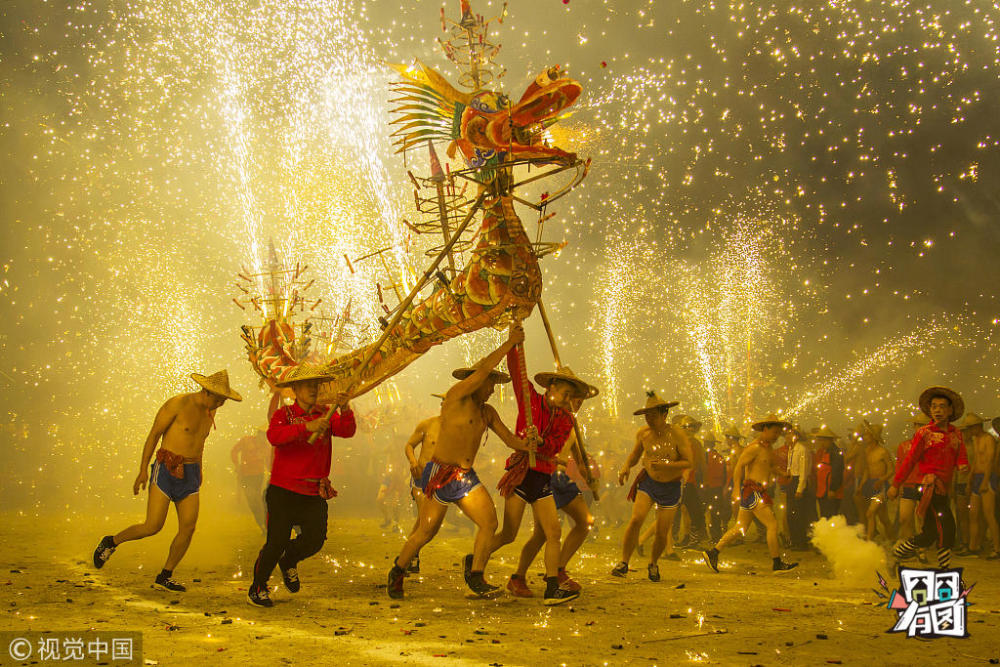 温亿中/视觉中国【舞龙嘘花】2015年2月8日,广东揭阳,乔林烟花火龙。乔林烟花火龙是古老的汉族民俗文化,历史沿革可追溯至明代,历经六百多年历史演绎过程,现在是国家级非物质文化遗产,每年春节,乔林村举办大型的烟花火龙文化活动欢度春节。