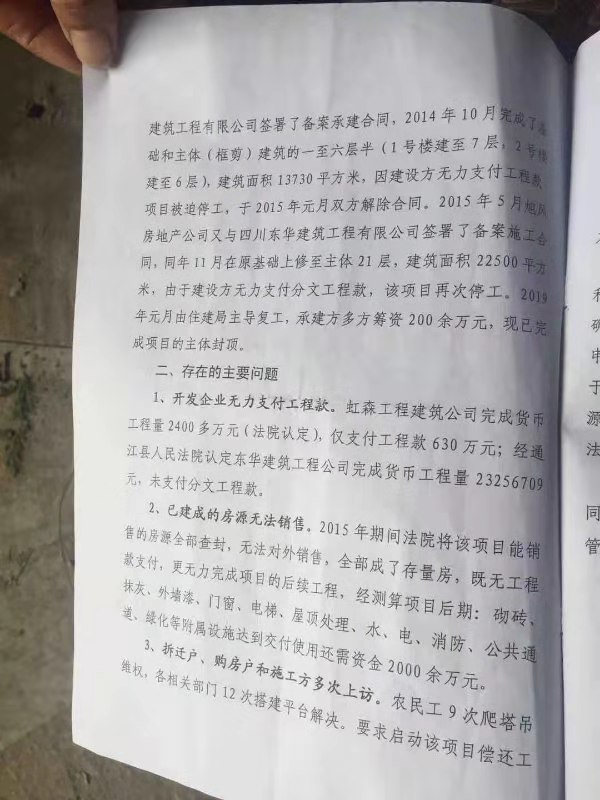 该项目从2015年11月停工后,我们多次积极配合通江县委、县政府、政法委、住建局、法院各相关部门进行协调,解决民工工资。2017年10月20日由县常务副县长何奎主持召开了南雅新世家专题会议,组织相当庞大的协调小组处理南雅项目遗留问题,但未落实行动。2018年1月8日,通江县委书记孙辉主持召开了各相关部门参与的信访联席专题会议,但也未落实行动解决问题。停工4年多来,工地上的民工9次爬上施工塔吊寻死要工钱,拆迁户数次上访要求尽快交房入住,政府和相关部门12次组织召开协调会,但至始至终没有落实解决。2018年11月工人要钱爬塔吊被判刑8个月,2019年6月15日从巴中监狱刑满释放。每当工地闹事,政府都是雷声大雨点小,现场激动,事后不动,根本就没有解决问题的具体方案和实际效果。2018年12月22日我们上访到四川省信访局,至今长达1年时间仍未得到解决。2019年1月临近春节怕工人闹事,住建局主持会议,同开发商、承建商协商复工。4月22日再次主持召开协调会,但至今未得到任何解决。2019年6月项目主体已全面封顶,二次结构装修目前已完成70%。2019年6月、8月,农民工自发组织了5名代表到北京上访,通江县住建局打电话要我们回来马上解决,住建局虽然住持了两次协调会,法院参与会议的法官的意见是县政府主持协调,可以先行解封一部分房子销售,售房款用于完善后期工程和支付民工工资。同时住建局向县政府发了〔2019〕122号文件的报告,县委孙书记再次召开各部门联席会议,但至今未作明确答复。我们一滴汗水一滴血修建的房子,被民间借贷和虹森公司超标的额查封,难道虹森公司修的房子不能抵偿他的工程款?开发商拖欠400多万元民工工资4年未支付,法院却在优先保障民间借贷违约金和利息!党的政策十分英明,可为什么我们农民工在通江面临的处境是如此的艰难呢?