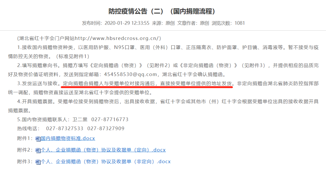上述工作人员还提到,建议捐赠人选择顺丰快递邮寄物资,捐赠人可拨打95338称是寄给武汉协和医院的医疗物资,申请走绿色通道。凡是符合医用标准的防护物资,可以选择邮费到付。捐赠邮寄地址为:湖北省武汉市江汉区解放大道1277号。医院对接人为胡秋实,其联系电话是13707162353。