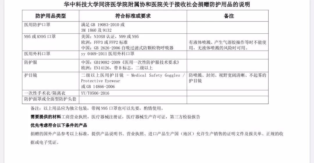 此外,上述工作人员特别强调,捐赠的物资须符合国家临床医用标准或进口标准,否则医护人员将无法使用。其中,部分物资须符合或高于以下标准:中国医用防护口罩:GB 19083-2010;N95口罩:美国NIOSH认证,非油性颗粒物过滤效率≥95%;欧洲N95口罩:欧洲FFP2标准;KN95口罩:中国GB 2626 强制性标准,非油性颗粒物过滤效率≥95%;外科口罩:YY 0469-2011(医用外科口罩);防护服 :GB19082-2009《医用一次性防护服技术要求》、二级以上医用防护服(一般衣服上有红蓝条纹);护目镜:二级以上医用护目镜 - Medical Safety Googles / Protective Eyewear。所有捐赠物资需院感部门审核后才可发送给临床使用。