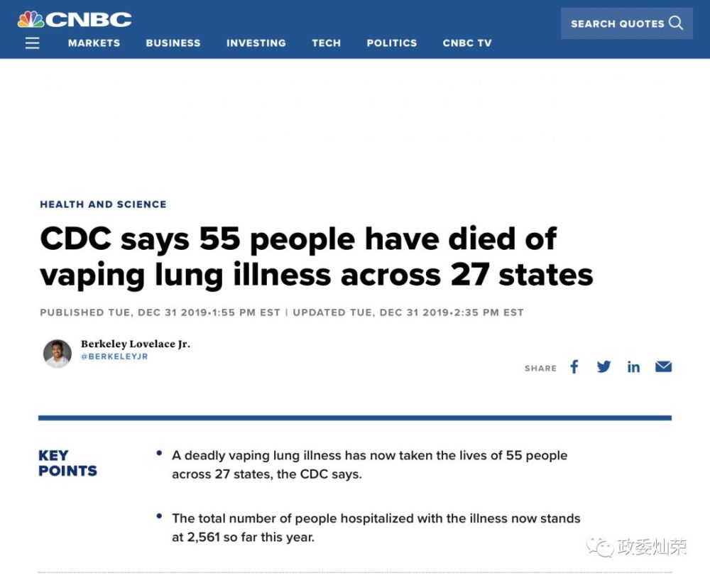 2019年12月31日,“CNBC”报道,2561人因“电子烟导致的肺炎”住院,55人死亡。