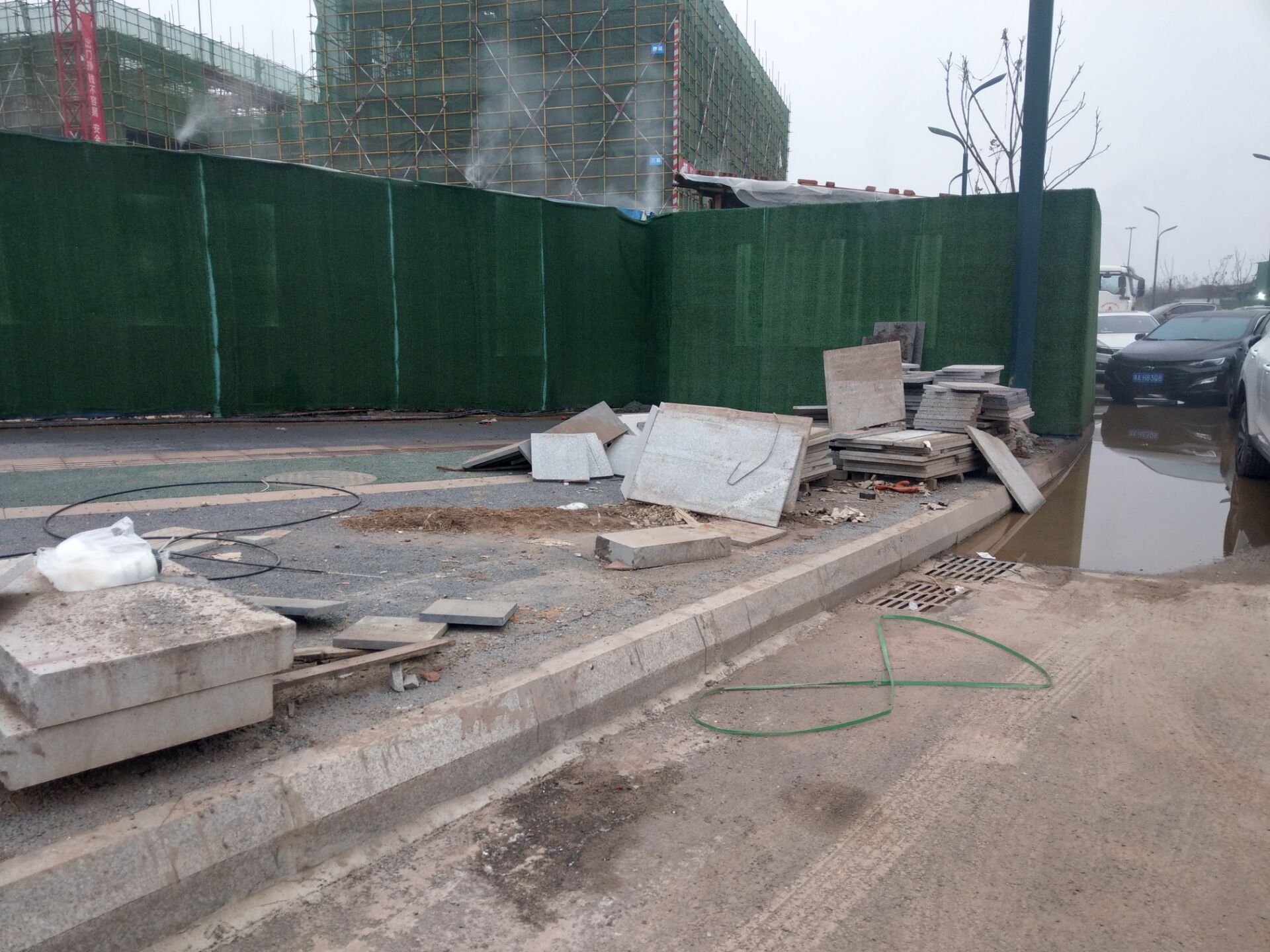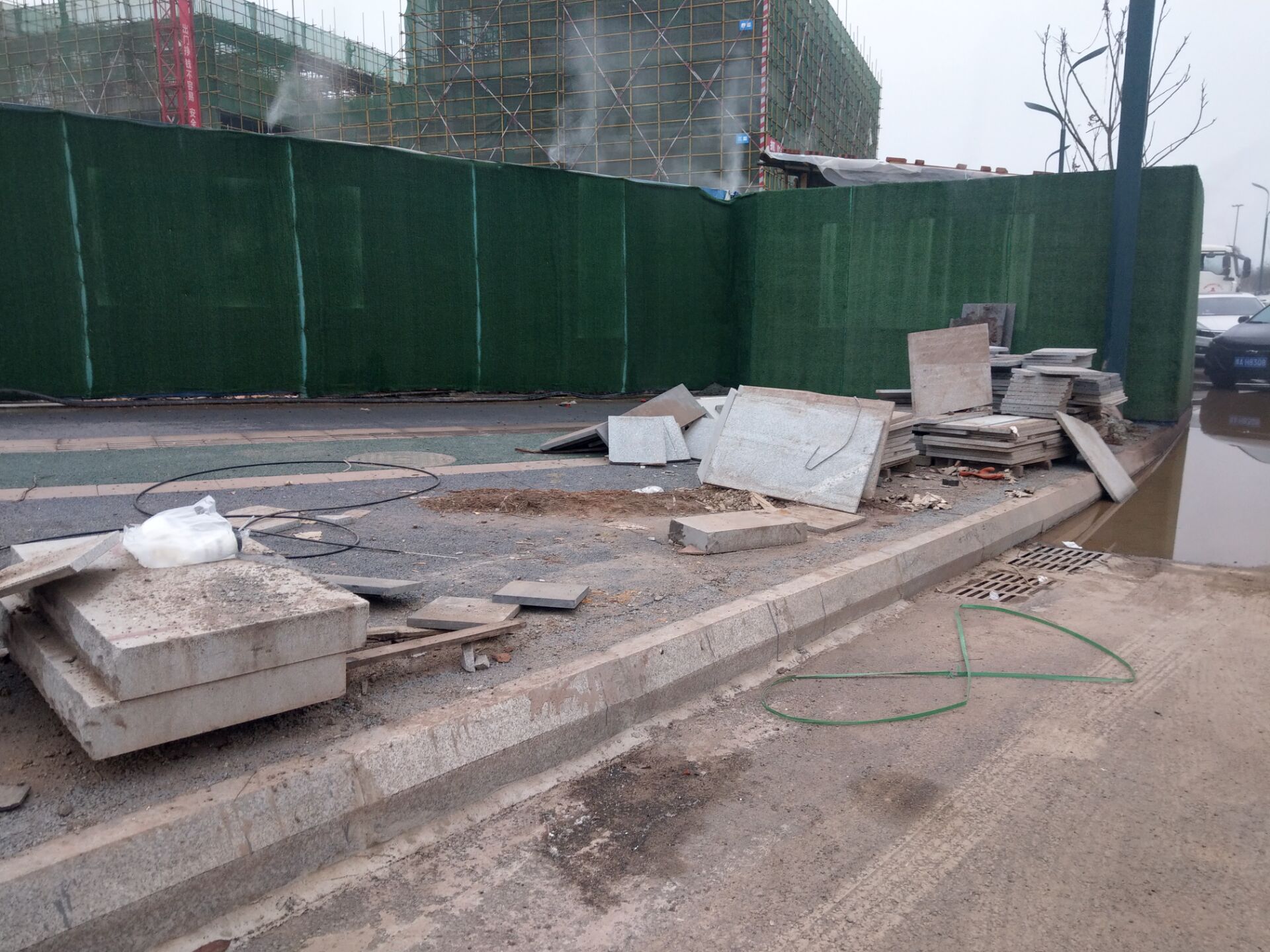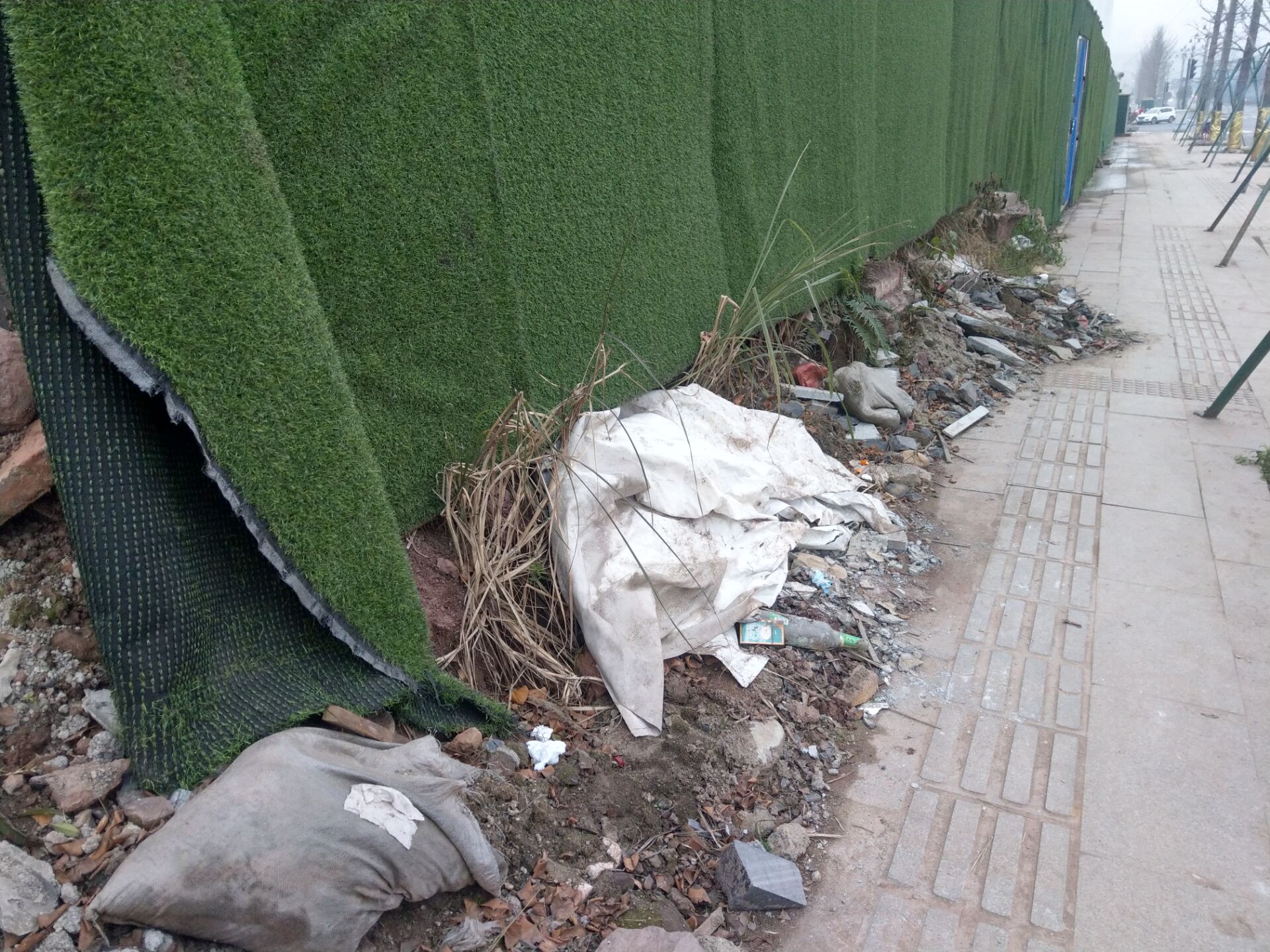 在靠近叫做什么珑玺湾的售楼部周边人行道上,能看到不少石材堆积,有些还是破烂不堪的样子 ,部分绿色围挡外边居然还有玻璃瓶,碎石等物,显得很是不雅,也不知是哪个单位或公司摆放在这里的,让来往于此的群众感觉心情不畅