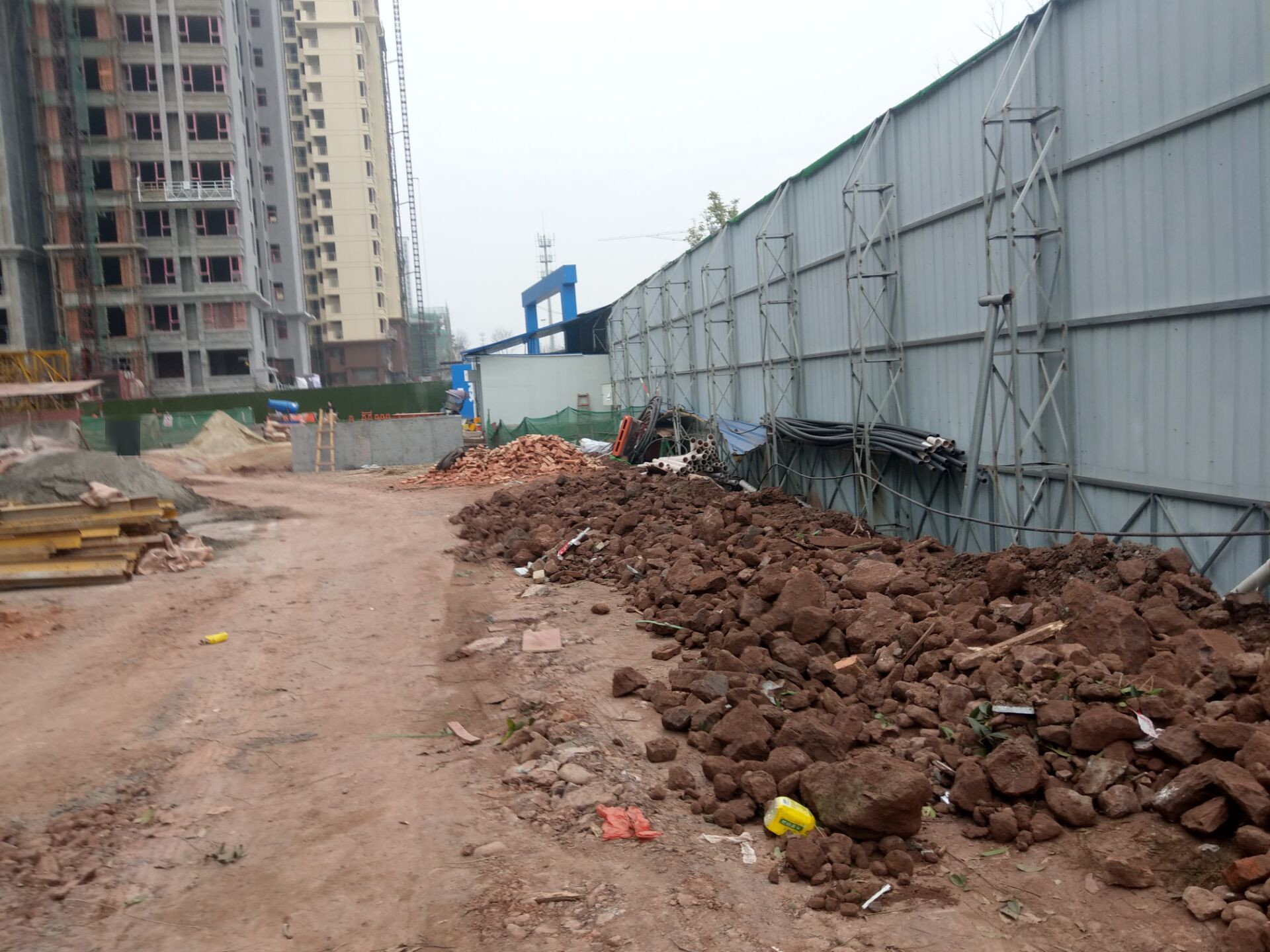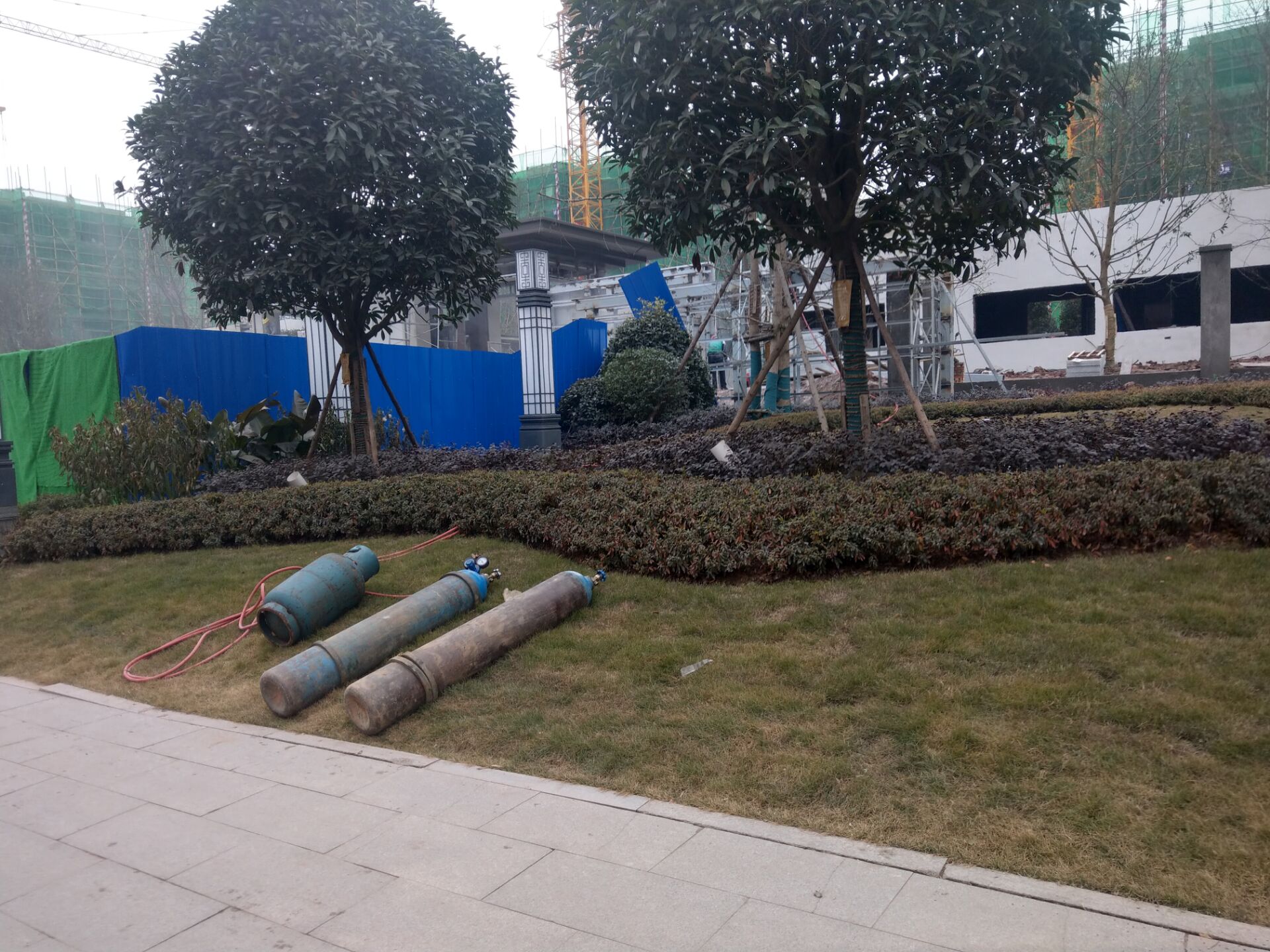 经过经过临江新区府荆大道附近,发现好多高楼正拔地而起呢,在叫做书香蘭庭?或者蘭庭书香?的工地旁,鄙人见到里面有不少或戴着安全帽或没戴安全帽的人员,正在进行各种施工作业,建筑材料堆积颇为杂乱,周围甚至能见到塑料袋、饮料瓶等垃圾,沙堆、土堆亦没有覆盖,大门外草地上居然还躺着气罐,而工地进出口不远处也顿放着气罐,建设场景显得较为粗旷 ,据过路人讲,这房子要修好,估计还有段时间了