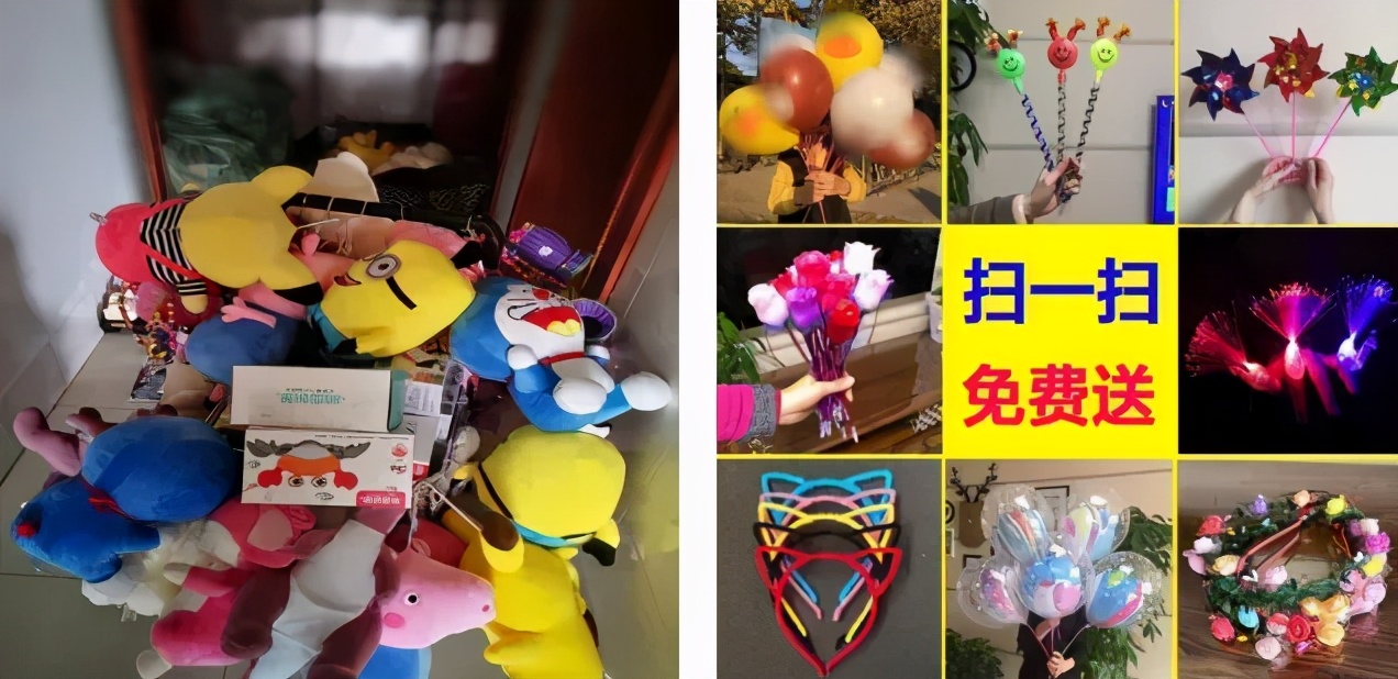 他们不停地喊着:“来看看喽!走过路过不要错过哟!扫二维码转发就送精美礼品!热水袋、小玩具、小背篓……什么都有!”