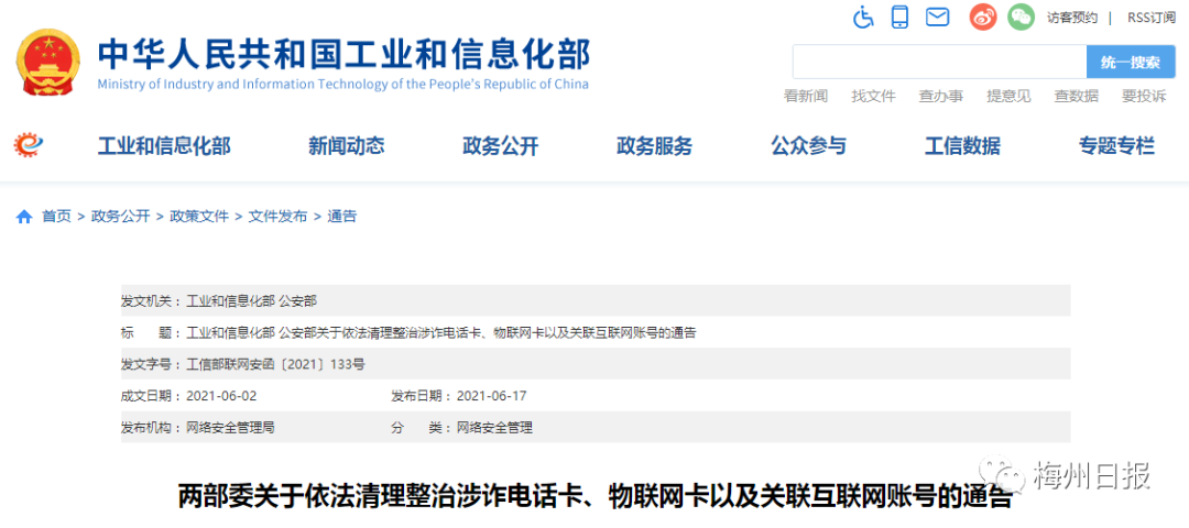 工业和信息化部、公安部 联合发布 关于依法清理整治涉诈电话卡、 物联网卡以及关联互联网账号的通告