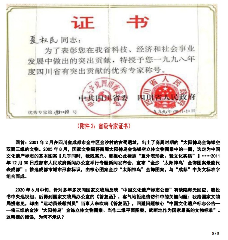 在依法屡次反映未被合理重视的今天,因笔者为支持“三星堆遗址-金沙遗址联合申报世界文化遗产工作”,现需要第一次向“太阳神鸟” 金饰文物的所有者——四川省人民、成都市民报告:自己“皆是对该文物利用中‘得小利而损大益’的‘因 小失大’受害者”;已有的“中国文化遗产标志”,竟只用了“太阳神鸟”金饰文物二维图案形象艺术美 的少量价值,却未展示或表达其金饰文物原貌为三维图案的最重要之文化本质美;其利用中的主次不分, 咄咄怪事……】