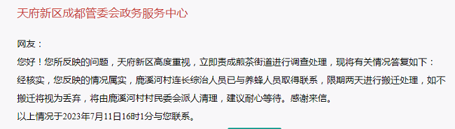 服务中心回复网民称,鹿溪河村连长综治人员已与养蜂人员取得联系,限期两天进行搬迁处理,如不搬迁将视为丢弃,将由鹿溪河村村民委会派人清理。
