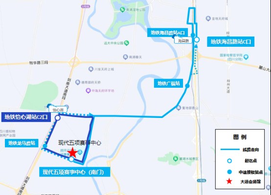 站点设置:现代五项赛事中心(南门)、地铁龙马路站、地铁怡心湖站。