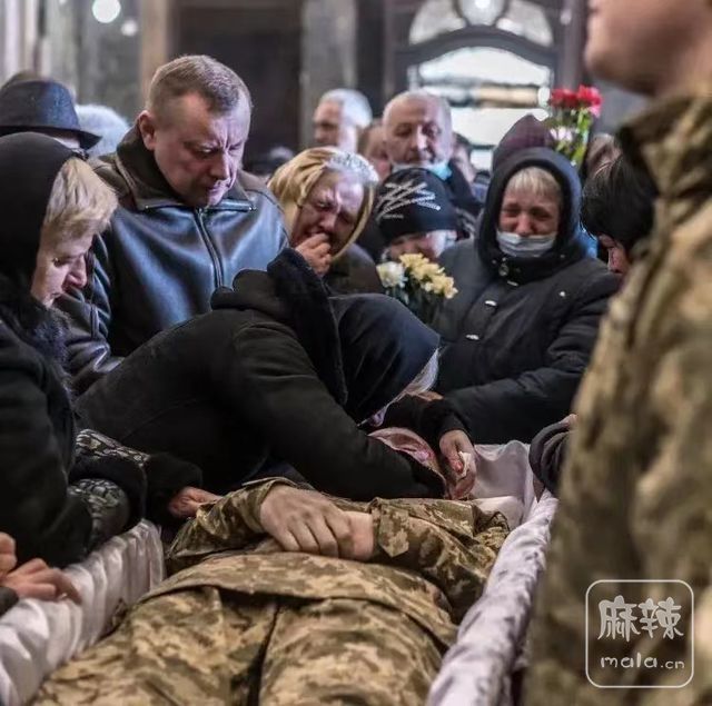 而在另一边、一位乌克兰母亲在儿子的葬礼上痛不欲生,捧着儿子冰冷的脸庞痛哭流涕,身旁之人尽皆动容,纷纷流下了同情的泪水。