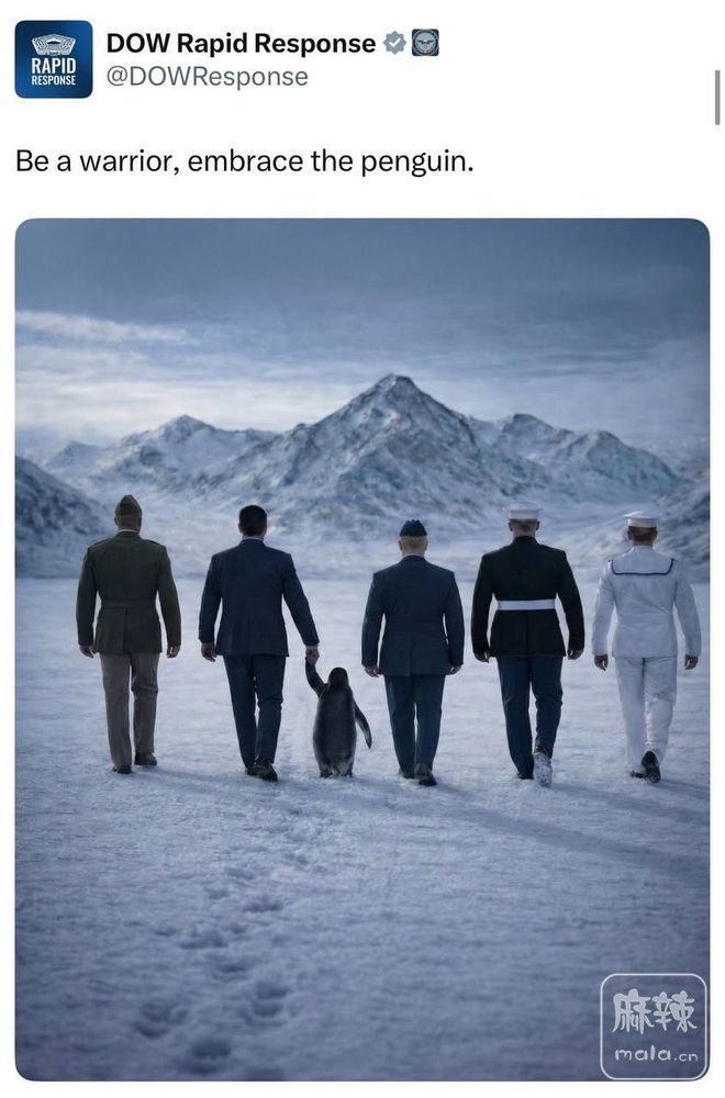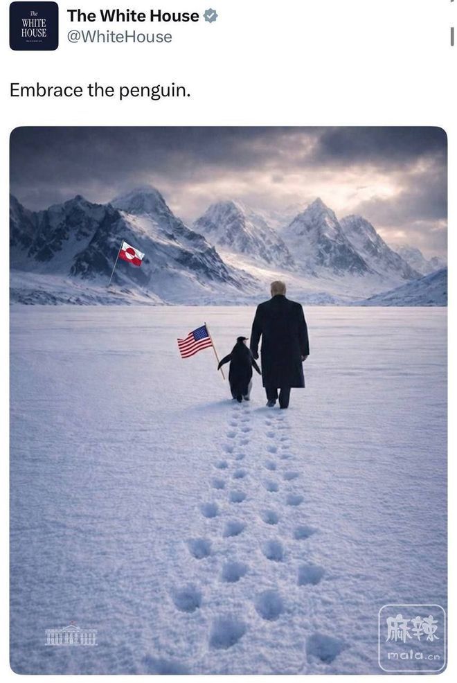 白宫发布了川普和美国人带着企鹅在格陵兰岛上漫步的照片。
