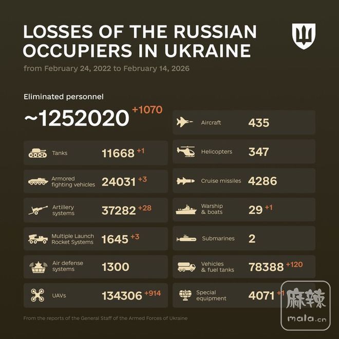 2026年2月14日,俄乌战争进入第1452天。