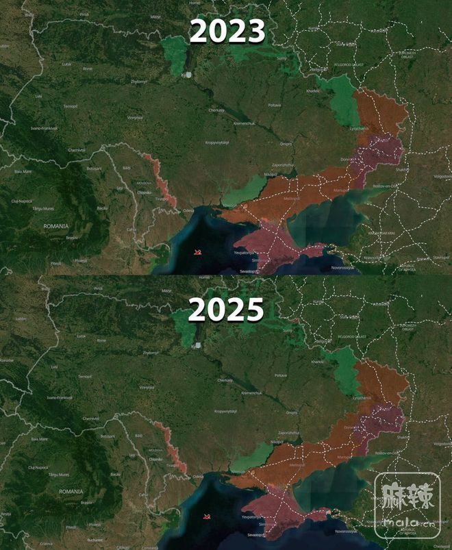 对比一下2023年和2025年的战线,差别微乎其微。难怪北约秘书长吕特会说,"俄罗斯人想表现得像一只强大的熊,但行动起来却慢得像只花园里的蜗牛"。