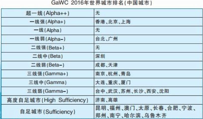 目前,国际上做城市评级最有影响力的机构是英国的GAWC(全球化与世界级城市研究小组与网络),根据其2016年版的世界城市评级报告,全球城市被分为这样几档: