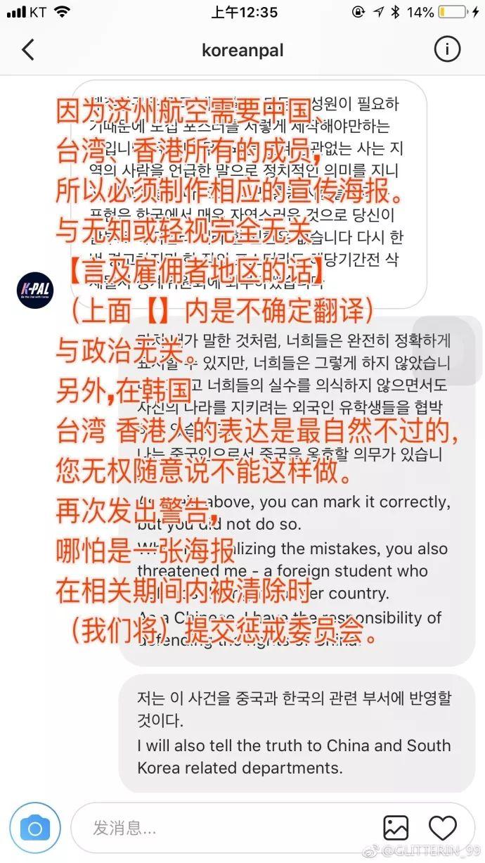 2.随后,@GLITTERIN_99将这一问题反映至K-PAL希望更正海报上的错误。↓(环环注:K-PAL与济州航空应该不是同一机构,它是韩国广播与媒体制作公司 ,为数字/在线营销代理,同时也为在韩外国学生和求职者提供生活服务。从海报内容看,它很像是K-PAL为济州航空制作了这款海报。)