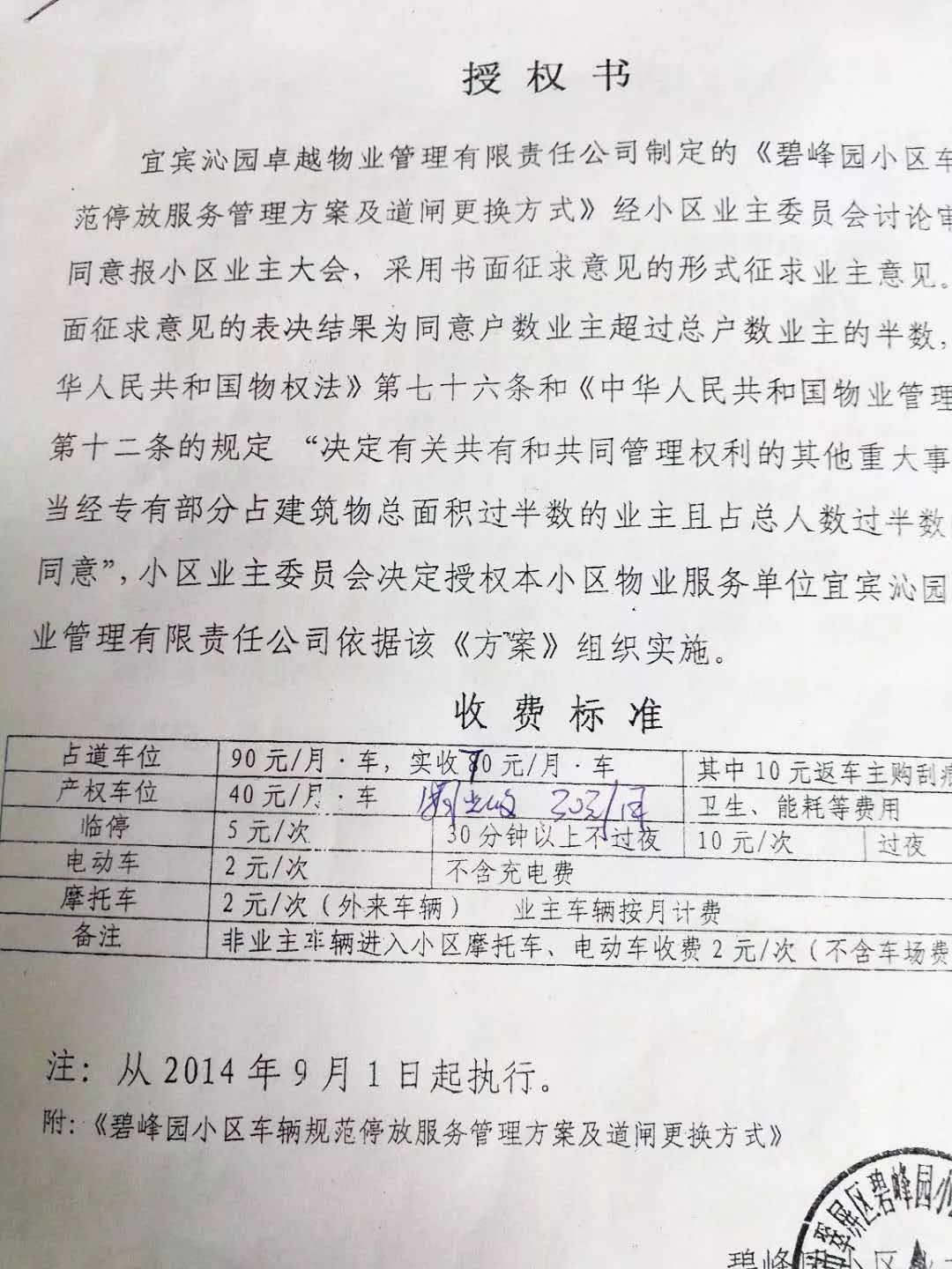 这张收费授权书(方案)上,没有写授权年限会有多久?也没有写明授权的物业法人与单位的社会代码。明确写有收取停车费的标准大概分为三个级别:占道车位70元/月,产权车位30元/月,临时停车收费2-5元/次。还有自物业接管至今,小区内所有广告收益及小区的维修基金从未公布过,这些钱又去哪里了呢?