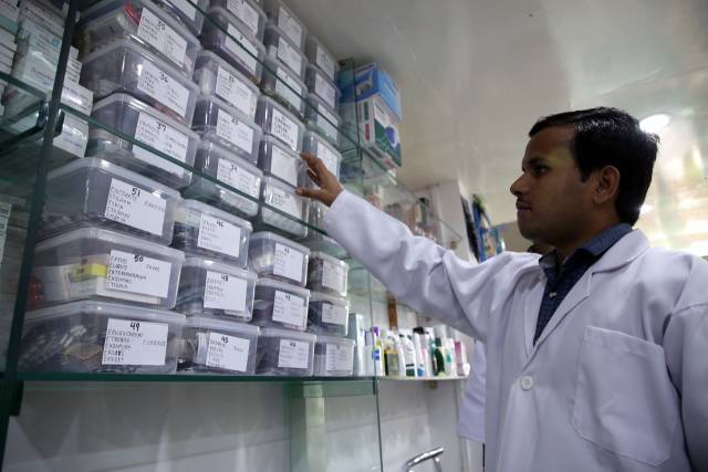 印度古尔冈地区的一间药房的药剂师正在为顾客查找药物。