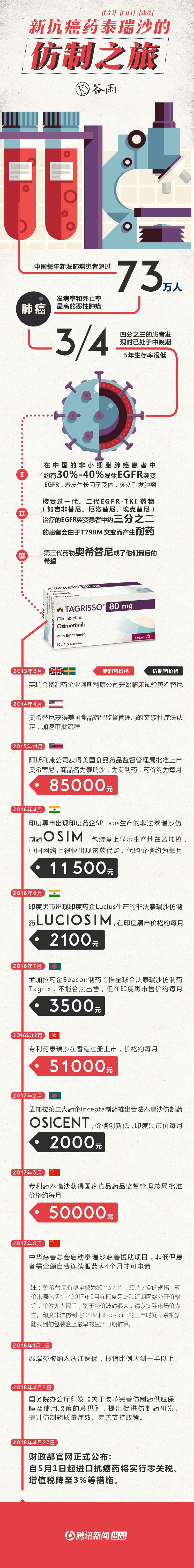 2017年5月,治疗肺癌的新药泰瑞沙出现在印度药监局的名录中,刚刚可以合法销售。仿制药迅速出现在市场上。仿制的孟加拉药Tagrix和Osicent迅速进入印度黑市。按照法律,这些孟加拉药不能公开在印度销售。在德里GreenPark附近一家药店,提供这两种药的名字后,一位店员表示,药物不在店里。打一个电话询问情况后,他告诉我,这两种药有货,但得先付50%定金,等两小时能到货。