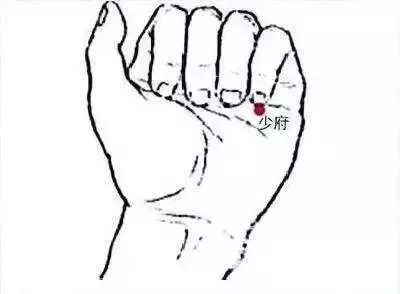取穴法:在手掌上取穴,自然微握拳时,小尾指指尖所碰触处,即为少府穴。