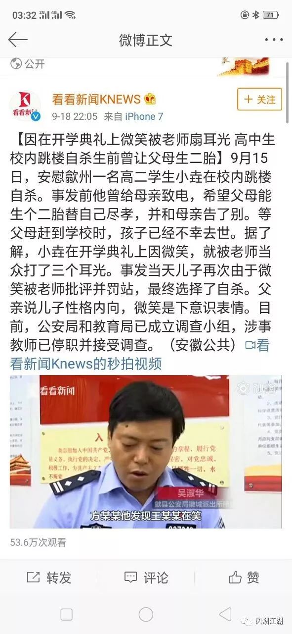 今天清晨看到一则新闻:【因在开学典礼上微笑被老师扇耳光,高中生校内跳楼自杀,生前曾让父母生二胎。】9月15日,安徽省黄山市歙州一名高二学生小垚在校内跳楼自杀,事发前他曾给母亲电话,希望父母能生个二胎替自己尽孝,并和母亲告别。等父母赶到学校时,孩子已经不幸去世。据了解,小垚在开学典礼上因微笑,被学校训导主任方某当众打了三耳光,晨会结束后,小垚继续被老师叫到办公室批评、罚站一上午。之后,小垚跳楼自杀。(信息来源于《看看新闻》)