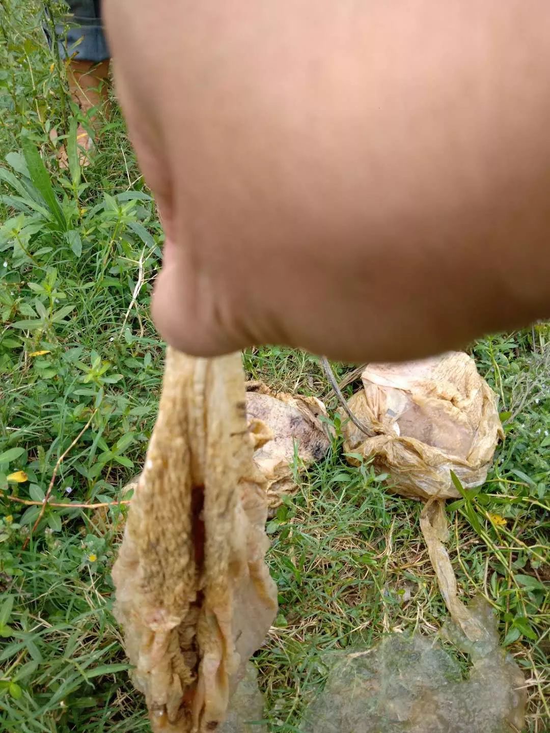 我又叫老人家将其它两个也捞上来查看,结果同第一个一样。我从事畜牧兽医几十年,大胆判断不是人或动物胎衣之类。