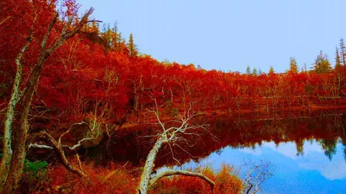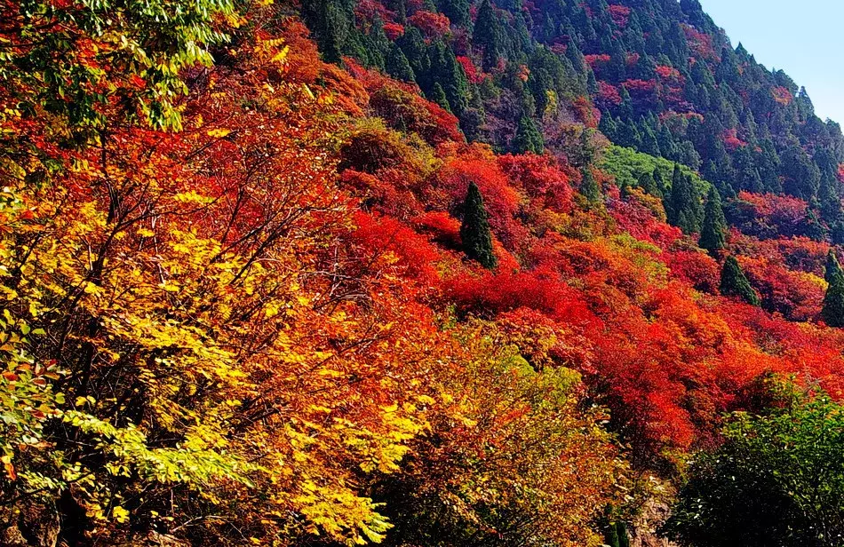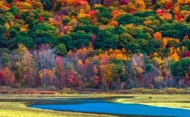 由于不同树种对霜冻的反应不一,有的火红,有的橘红,有的金黄,近有松柏,远有青山,交相辉映,更显得五彩缤纷。