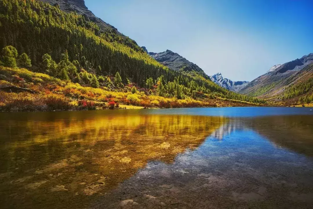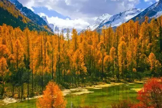 秋季的玛嘉沟有美丽变幻无穷的五色海,随着阳光的角度而变幻着色彩,或橙或红或黄,五彩斑斓,犹如天然的巨幅油画,令人迷醉!
