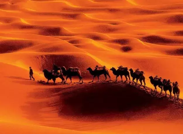 秋季,金黄的胡杨林,与三五成群的骆驼在浩瀚、辽阔、荒芜的沙脊上共同勾勒了一幅荒漠的傲人画卷。
