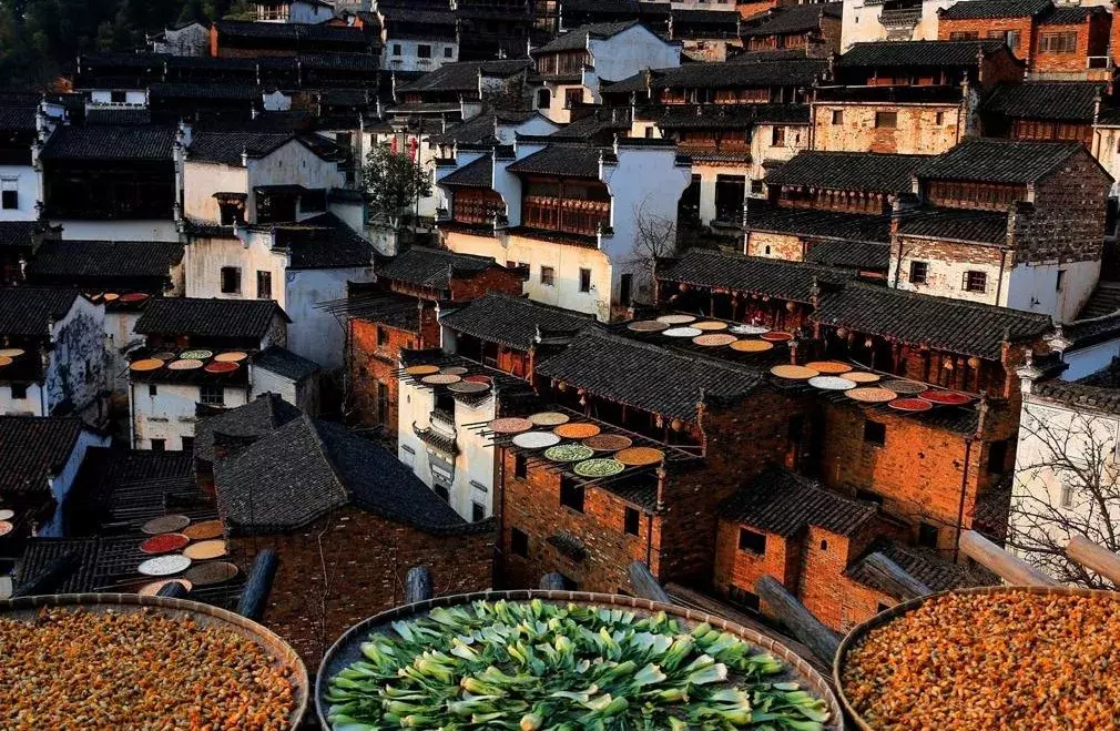 秋季,每当日出山头,民居土砖外墙与晒架上、圆圆晒匾里五彩缤纷丰收果实组合,五颜六色的农作物与黑色屋顶之间重重叠叠,甚是壮观,称之为“晒秋”。