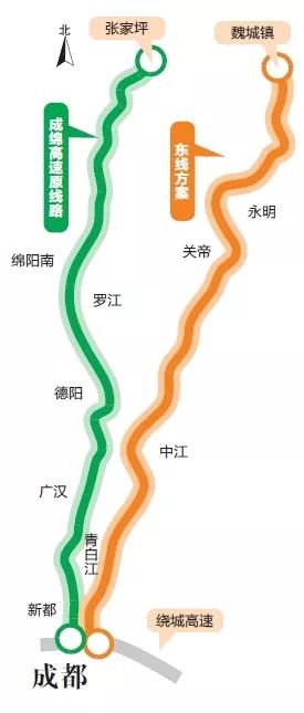 东线走廊方案:路线起于绵阳市魏城镇附近,经绵阳游仙区至三台县永明镇与绵遂高速公路相交,之后路线“四改八”加宽改扩建绵阳南环线高速公路至杨家三联村附近,经涪城区、中江县、旌阳区、广汉市、金堂县,后路线跨越成都第二绕城高速至青白江,路线在成金青快速通道高架至成青止点,接成都绕城高速,采用八车道。