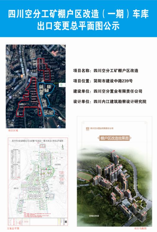 四川空分工矿棚户区改造一期项目规划设计方案于2013年11月26日经简阳市城乡规划委员会三届十六次会议审议通过,于2013年12月签发方案设计文本。项目建设期间,因场地北侧道路施工,道路高程比原设计高程提高,使原设计3-6号楼车库出入口不能与北侧道路平顺相接,现建设单位申请对3-6号楼车库出入口进行调整。