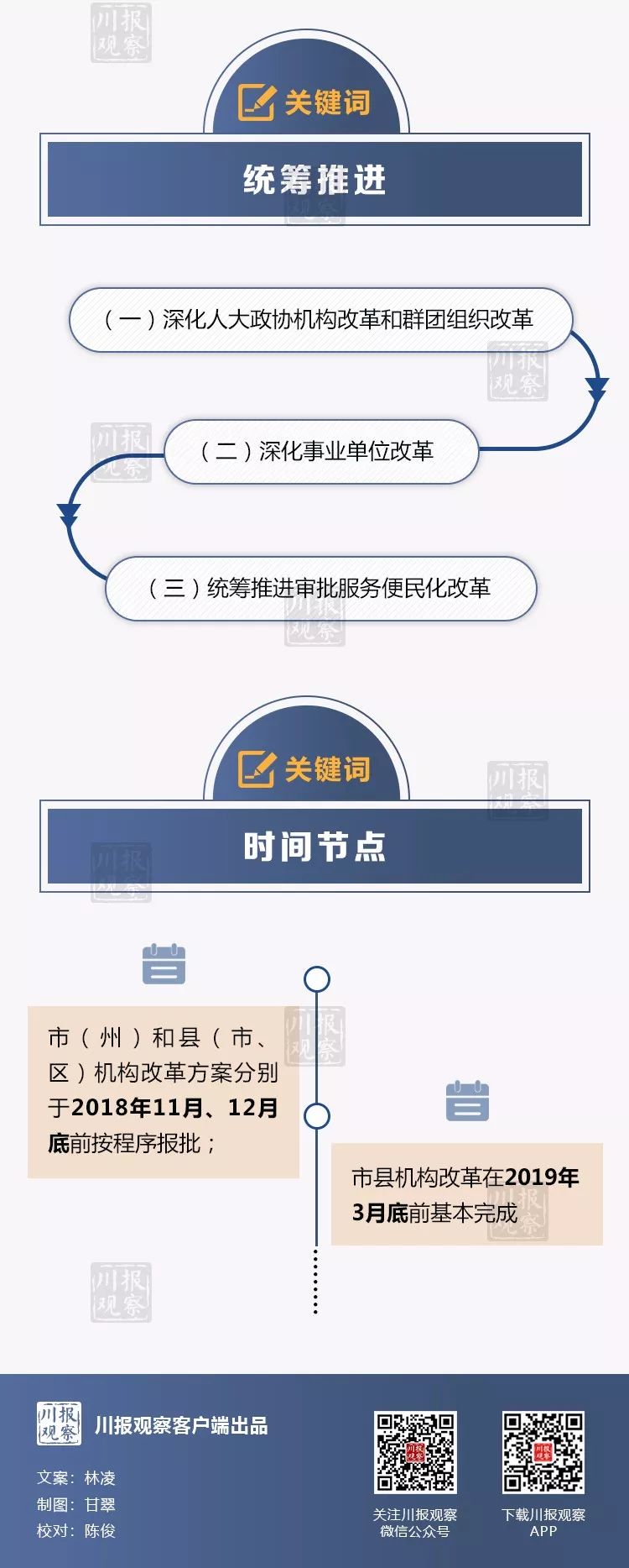 根据安排,成都市的改革方案由省委审核并报中央备案后批准。市(州)和县(市、区)机构改革方案分别于2018年11月、12月底前按程序报批。